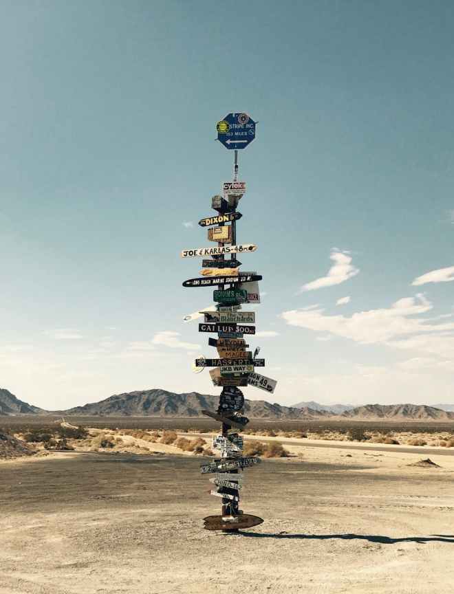 brown road sign on pavement near mountain